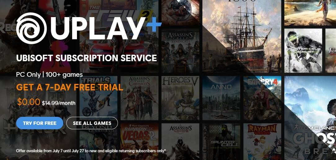 從 7 月 7日 到 7 月 27 日,每個 Ubisoft 帳號可參加 UPLAY+ 訂閱服務免費試玩體驗。為了開啟免費試玩,必須提供一個有效的信用卡,從註冊免費試玩之日起,可體驗7天時間,超過 7 天後將會每月扣費 14.99 美元,除非在 7 天有效期結束前取消這一服務。