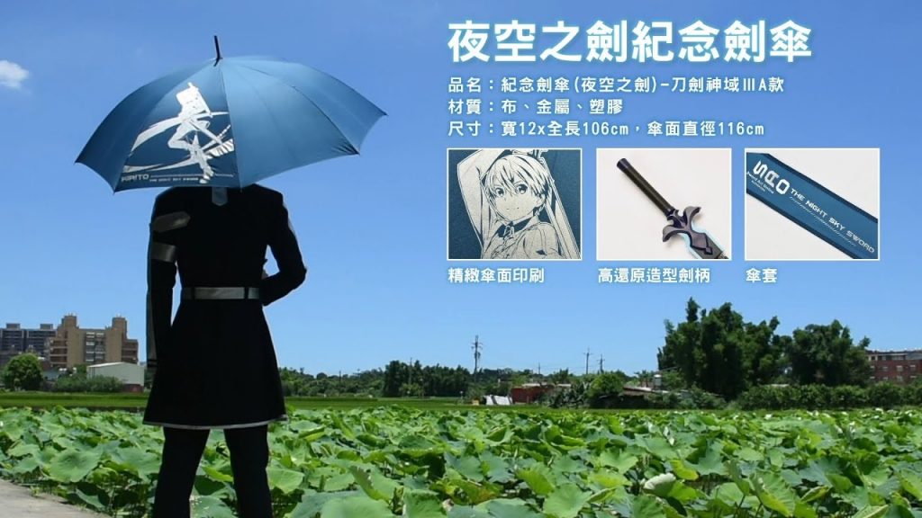 全新精品《刀劍神域》「夜空之劍紀念劍傘」,由於製作期長,可製成數量稀少,因此製作團隊表示,這將會是最後一把《刀劍神域》系列劍傘。夜空之劍:UW篇中,是桐人的主要武器之一,原是「惡魔之樹」基加斯西達的樹枝,後由工藝師薩多雷鑄成劍。名字為優吉歐在臨死之前為桐人愛劍所取,象徵著夜空中的星星,在黑暗中閃著光芒,像劍的光輝一樣。