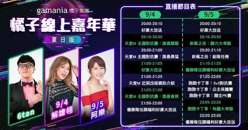 橘子線上嘉年華-夏日版活動正式公布,9/4(五)、9/5(六) 20:00-22:00期間,將由電玩巨魔六嘆與兩代電競女神解婕翎、阿樂攜手主持,並邀請超過20名電玩實況主、正妹直播主及明星藝人同場PK《天堂M》、《新楓之谷》與《跑跑卡丁車》。除精彩節目內容,分享活動即有機會獲得高額GASH點數、直播現場再抽最高beanfun! 8,888元零用金!