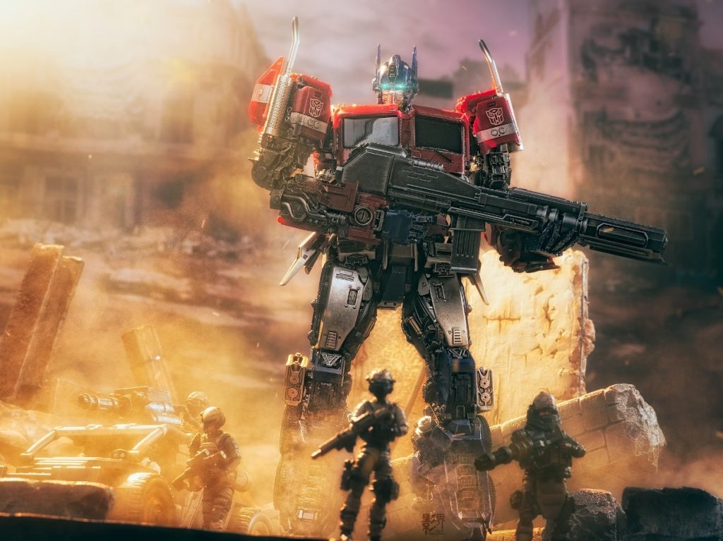 接下來,我們趕緊切入主題,來介紹變形金剛的拍攝手法吧!首先,為了將模型拍起來具有故事性的感覺,在柯博文的周圍特別搭配了2.75吋的暗源系列產品,就此來營造出人類與柯博文協同作戰的感覺。