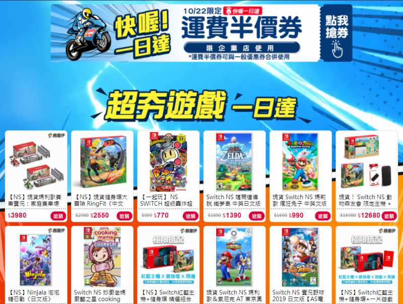 最近10月推出超夯結合AR實境的一款Switch遊戲《瑪利歐賽車實況:家庭賽車場》,玩家們可以在自家客廳操控「實體遙控車」來場真實刺激的瑪莉歐賽車比賽!看好年底送禮需求以及居家休閒娛樂商機,有閑娛樂電商公開發布了一則消息,10/22 中午12:00 Switch主機下殺只要$8,888,不僅價格低於市售價,還主打一日送「當天買當天到」的服務,除了各式遊戲相關商品外,還有相當多的桌遊同樂商品供消費者選擇。