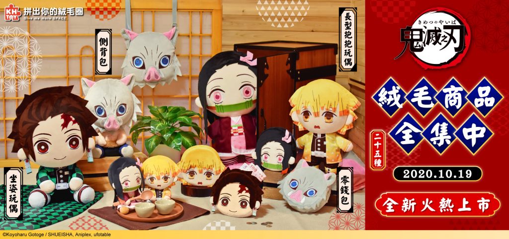 台灣廠商 KHtoy 宣布取得全台唯一《鬼滅之刃》絨毛周邊「正版授權」,在10月19日推出推出一系列《鬼滅之刃》絨毛玩偶和周邊商品,讓粉絲可以隨時隨地將《鬼滅之刃》抱在懷裡!