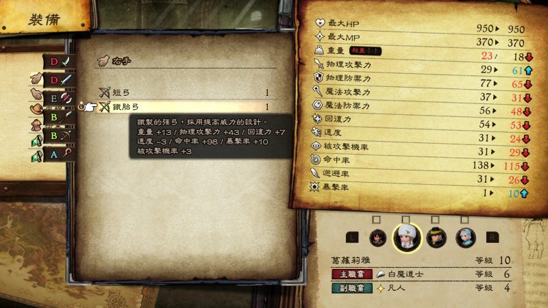 另外,本作有著一般JRPG很少見的負重系統,角色的裝備都有各自的重量和屬性,一但超過重量雖然還是能裝備,但全體能力都會大幅度下降。所以挑選重量內適合的裝備,也是本遊戲的技術指標之一。乍看之下很容易,但實際配起來還真的有點複雜呢。