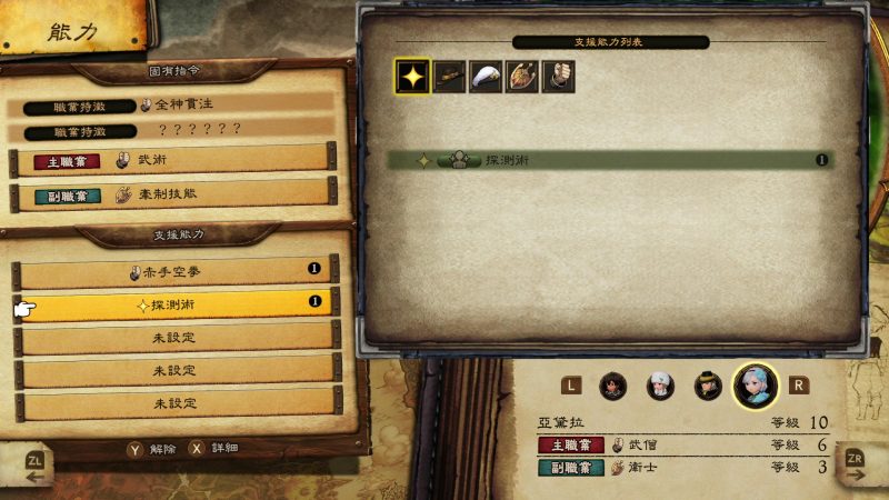 且就算你沒有將職業裝備到欄位上,如果是已經解鎖的職業支援技能,你還可以自由的配置到角色上,例如武僧的「赤手空拳」,就是專門增加空手攻擊力的輔助技能,就算是同樣的職業組合,也可以在這邊玩出差別來。只可惜體驗版最高只能提升職業等級到10等,相信在解鎖更高等的技能時,搭配也會更豐富吧。