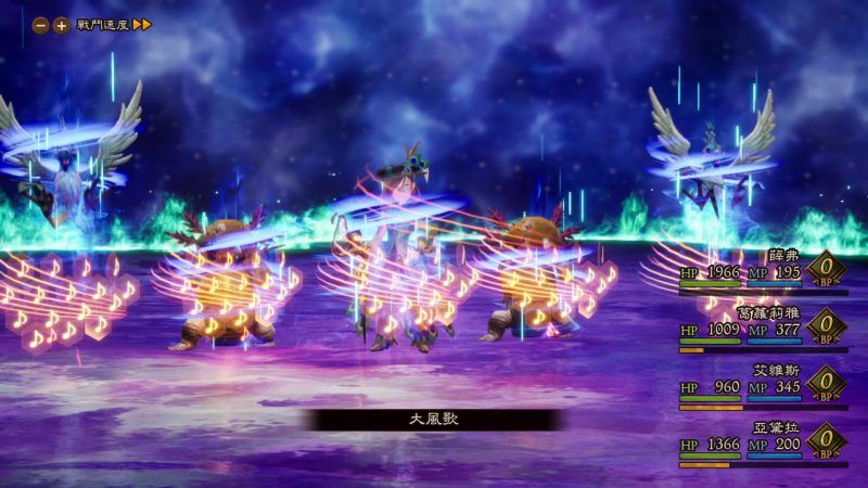 老實說,雖然小編自負對JRPG的認識很深,但《勇氣默示錄 2》的戰鬥真的相當有難易度。由於上述的勇猛系統對手也能使用的關係,如果像其他JRPG仗著有強力的技能就隨興亂打的話,就算是在普通難度也很有可能一個不小心被怪物COMBO直接倒下滅團。且由於部分的BUFF和DEBUFF是可以疊加的,所以有時候弱小的BUFF技能,在連續施放後也會變得很有威脅性,要熟練戰鬥需要不少的時間。