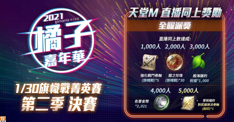 此外,2021「橘子嘉年華」實體展區將於1/29-1/31盛大展開,1/29當日國民老婆泱泱與微笑女神林真亦將Cosplay《天堂M》英雄角色PK人氣;《天堂M》KOL玩家小屁﹑DingDing與令狐沖爺爺將擔任三日關主,現場PVP挑戰即可獲得限量周邊,預測旗幟戰菁英賽第二季最強血盟再抽虛寶。《龍之谷:新世界》與《新楓之谷》現場也都會有活動等待玩家挑戰。