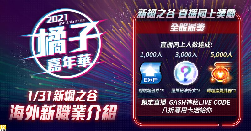 1/31(日)《新楓之谷》最香主持組合解婕翎、阿樂將與瘋狂老爹、阿法、宇正與艾希等資深玩家共同試玩改版地圖賽拉斯,並全台首度揭開新職業-墨玄神秘面紗。四天直播期間,beanfun!將天天發出最高$6,666零用金寶箱,留言通關密語可拿GASH折價券、鎖定神秘LiveCode再拿限量加碼好康。