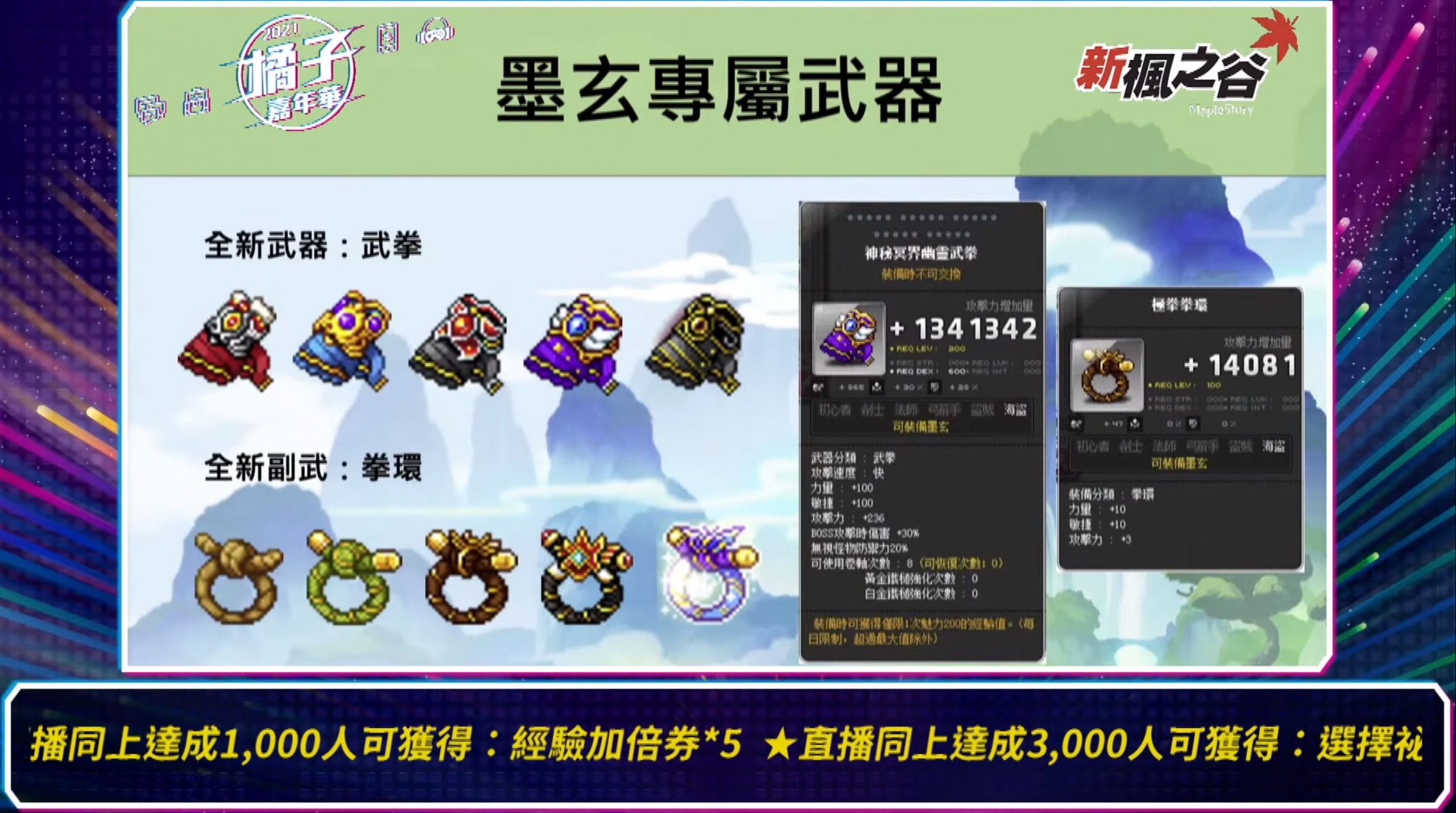 為期四天的2021橘子線上嘉年華線上直播昨(1)日正式落幕,不過在最後一天線上直播節目邀請到電玩女神解婕翎、阿樂主持,瘋狂老爹、阿法、宇正與艾希等資深玩家共同試玩改版地圖賽拉斯。帶給《新楓之谷》玩家最新海外限定職業「墨玄」與改版新消息,以及各種好康。