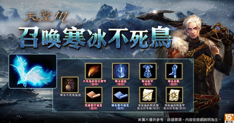 慶祝「騎士道」預先登錄登場,本週特別釋出新副本追加活動:【召喚寒冰不死鳥】於3月3日至3月10日每日20:10,「象牙塔的入口」將出現「寒冰不死鳥」與手下,成功擊殺可取得「寒冰不死鳥福袋」與天幣,開啟機率性獲得「寒冰系列英雄級裝備」、「受祝福的對武器施法的卷軸(刻印)」、「英雄製作秘笈(刻印)」等稀有裝備及道具。