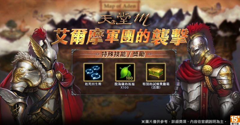 【試煉副本追加活動-艾爾摩軍團的襲擊】於3月3日至3月10日,玩家可於副本內挑戰怪物,機率性出現「艾爾摩將軍」,玩家可使用副本技能「範圍起死回生術」攻擊怪物,獲得大量經驗值及「殷海薩的祝福」,成功通關可獲得「特別的試煉獎勵箱(活動)」及100「殷海薩的祝福」。開啟機率性獲得「稀有製作秘笈(刻印)」、「龍之鑽石(活動)」等虛寶獎勵。以上活動內容以官網公告為準,請持續鎖定《天堂M》官方網站消息。