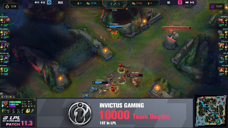 iG戰隊本季至今留下六勝五負戰績,而它們日前對陣Bilibili Gaming的第二局創下一項紀錄,TheShy在開賽不到十分鐘遭到對方打野烏迪爾GANK成功,這個死亡也讓iG戰隊在LPL史上總死亡數突破五位數大關,成為LPL第一支總死亡數破萬的隊伍。