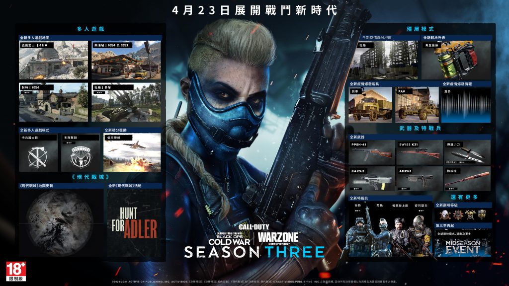 從第三季推出開始,玩家將可以參加限時活動「尋找阿德勒」,並在《黑色行動冷戰》和《現代戰域》中進行特殊的遊戲內挑戰,追查阿德勒的下落。只要完成這些情報挑戰,即可解鎖活動獎勵,包括武器飾物、名片背景和一個全新的特戰兵造型等。