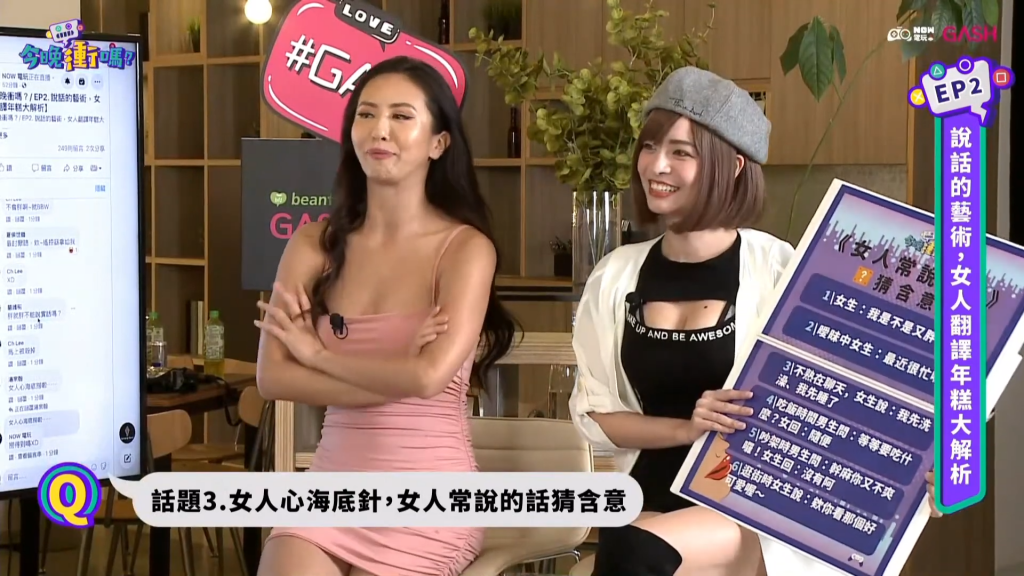 節目最後還有一題「女人常說的話」來讓主持人解讀,講到伴侶會遇到的情況,其中女生常會問「我是不是又胖了?」,這讓鬼鬼和薔薔都直言背後含義是「只想聽到伴侶表示自己是唯一」也讓派翠克和海產感嘆「真的是說話的藝術啊」。