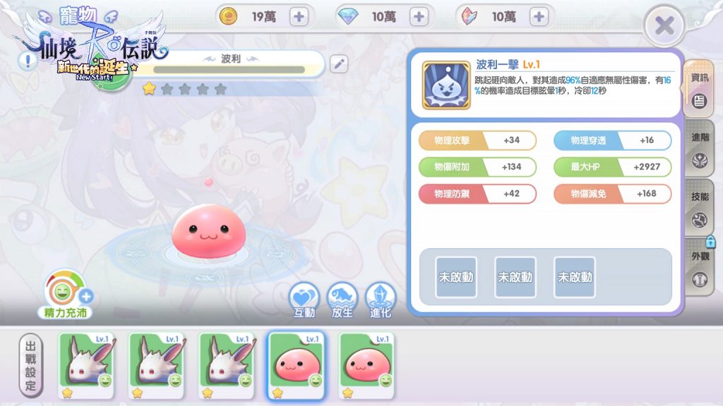 粉嫩粉嫩的波利之後也會越變越強。 當然寵物並不是只有基礎屬性這麼單純,寵物也有各自的技能與天賦。先來說說天賦部分,不同的寵物會有各自不同的天賦(被動技能),玩家可以透過多次捕捉寵物獲得「初始天賦」、或是讓寵物完成進化來獲得「進化新天賦」。比較特殊的是透過進化獲得的天賦,這類天賦可以透過消耗特定道具來升級,雖然有失敗機率,但是並不會影響寵物本身的任何能力。