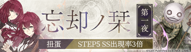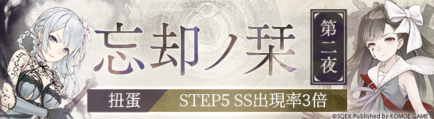 SS機率提升3倍!階梯扭蛋「忘卻之栞」開始階梯扭蛋「忘卻之栞 第一夜&第二夜」活動期間內,將有機會獲得全新聯動職業的解放武器。此外,每次扭蛋進行到STEP5時固定出現一個SS,SS出現幾率提升3倍!