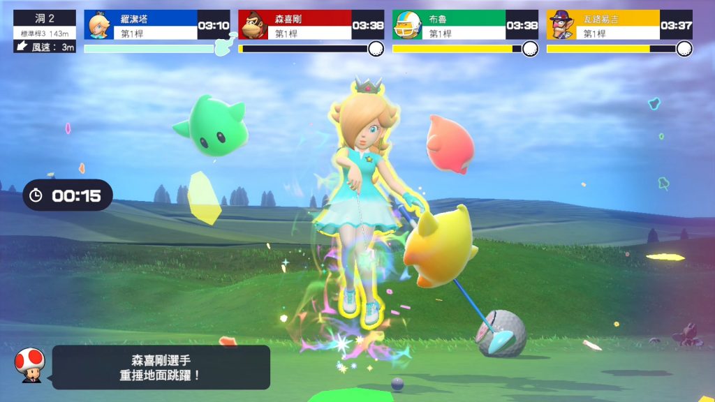 而特殊衝刺也是同樣的道理,這個系統可以讓你耗費大量的體力瞬間加速,且可以順便撞飛「其他人的球」並破壞場上的機關,使用得好的話,不只是跑的會比較快,干擾能力也不輸特殊擊球。像是筆者就很喜歡故意踩過對手的球把它推去草地或沙地讓球OB,光是這樣一個簡單的小動作,就能讓對手多費兩桿以上的桿數,相當划算。