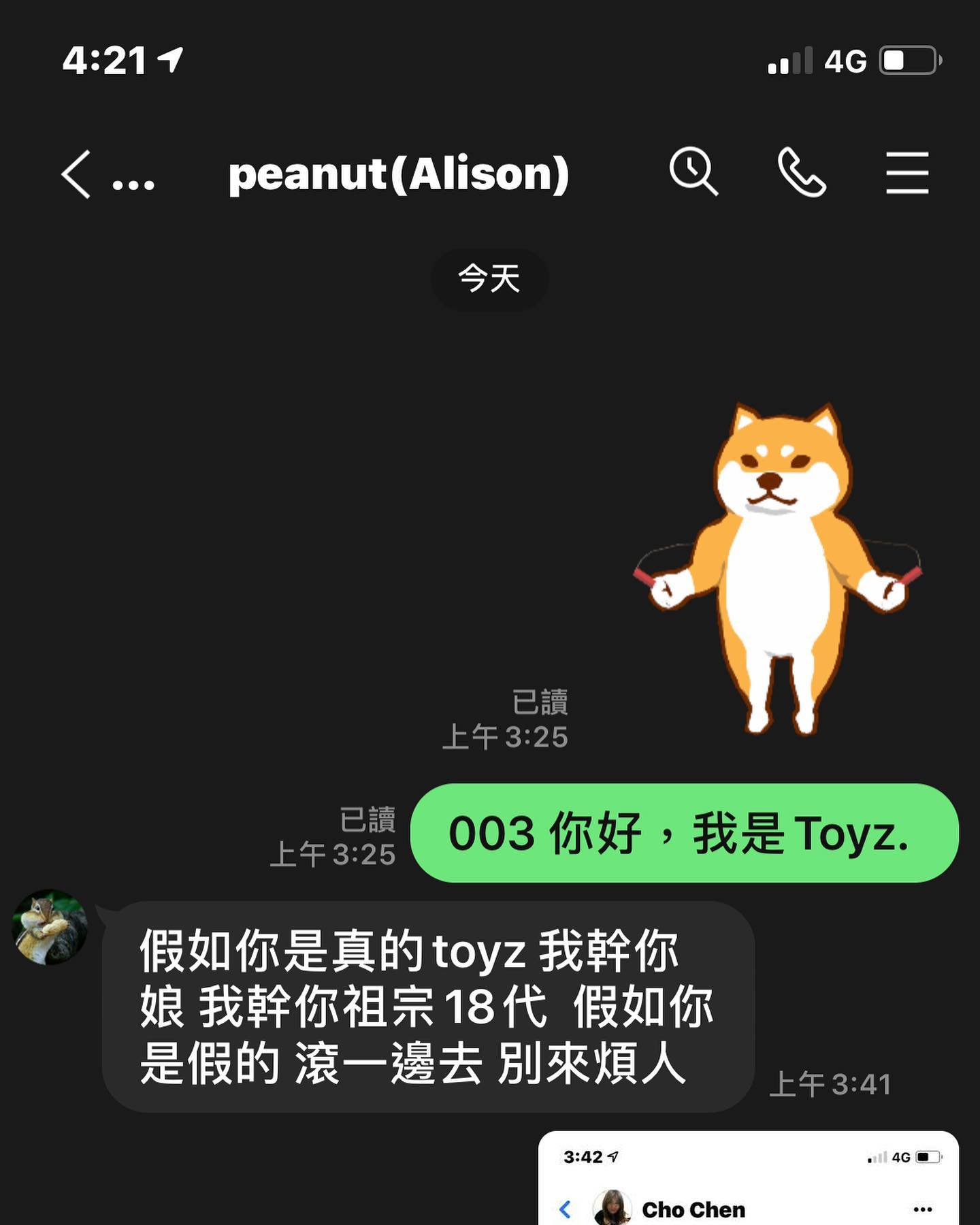 Toyz 今日凌晨 4 時 31 分左右,在個人臉書上貼出了數張截圖,只見截圖中 Toyz 利用 Line 與 003 聯繫,一開始先表示「 003 你好,我是 Toyz 」,結果沒想到反被嗆「假如你是真的 Toyz ,我〇你娘,我〇你祖宗 18 代;假如你是假的,滾一邊去別來煩人。」讓 Toyz 相當錯愕,回覆「要聯繫方式只是為了罵這對對嗎?還是這也不是你」
