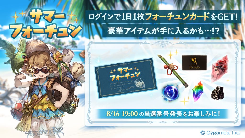 【サマーフォーチュンについて①】8/16(月)に当選番号発表を行いました「サマーフォーチュン」に関しまして、多くの皆様から頂いたご意見を受け、全騎空士の皆さまに「3等確定」のフォーチュンカードを配布いたします。