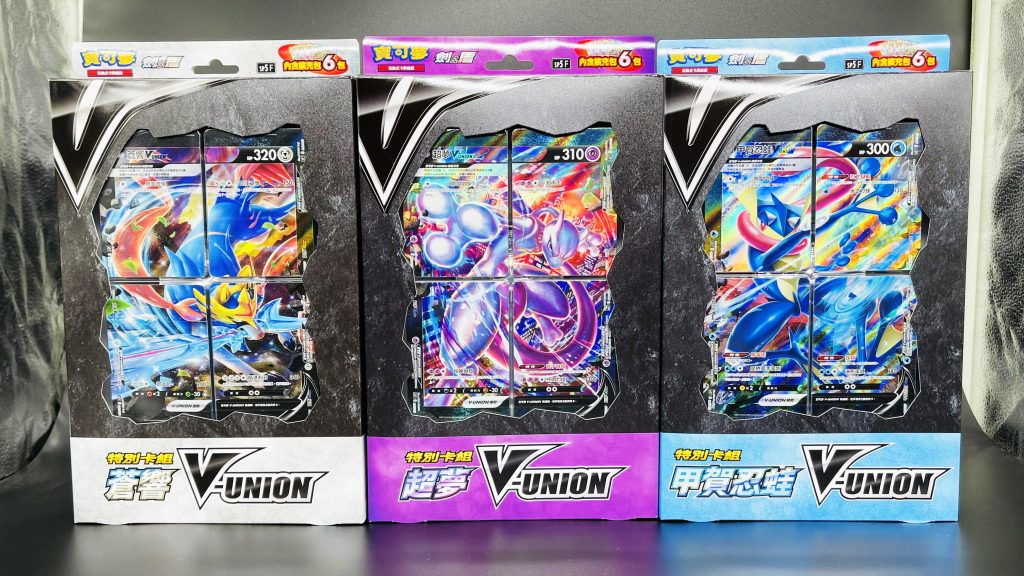 本次的「V-UNION」第一彈特別卡組分成三盒,分別是《超夢》&《蒼響》&《甲賀忍蛙》等三組。這三組卡包都附上了四張一套完整的V-UNION卡片,同時也包含了六包《摩天巔峰》和《蒼空烈流》的卡包,和一張特典卡「芭內特博士」。讓你在搭配時能夠順便增強戰力。