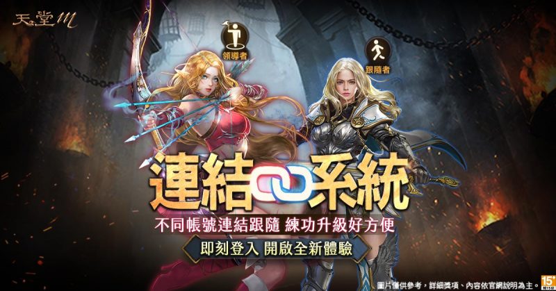 《天堂M》於9月8日推出雙系統「連結系統」及「爵位系統」,讓玩家練功殺敵更升級!「連結系統」Lv.80以上玩家,可設定相同伺服器的不同帳號進行連結,分別為「領導者」角色及「跟隨者」角色,啟動「連結跟隨」一同向目標發動攻擊,開放區域為「傲慢之塔」及「信念之塔」,可連結時間限制為24小時;「跟隨者」可設定2種職業技能供「領導者」使用、「領導者」可控制「跟隨者」進行部分操作,讓玩家練功更加便利。