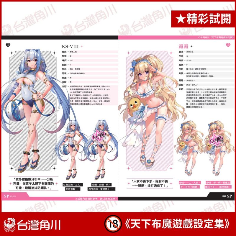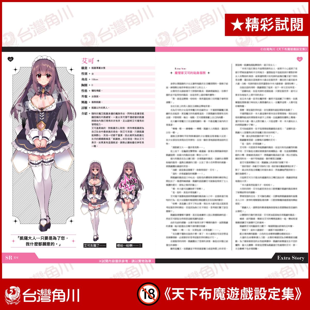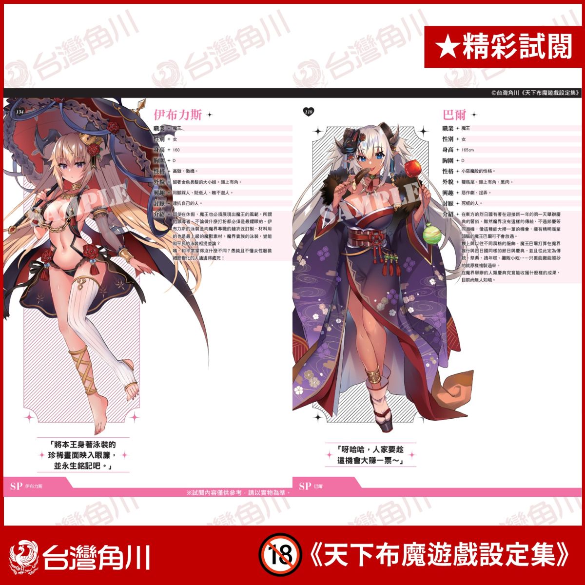 2021台灣國產成人向手機遊戲《天下布魔》與台灣角川合作,將於9/22推出《天下布魔遊戲設定集》。完整收錄從N卡到最強SSR卡、SP卡豪華角色陣容的「美圖立繪」及「調教場景」、超人氣角色伊布力斯、露露、靜、艾可的「番外篇小說」及遊戲製作人刃霧翔長篇訪談。