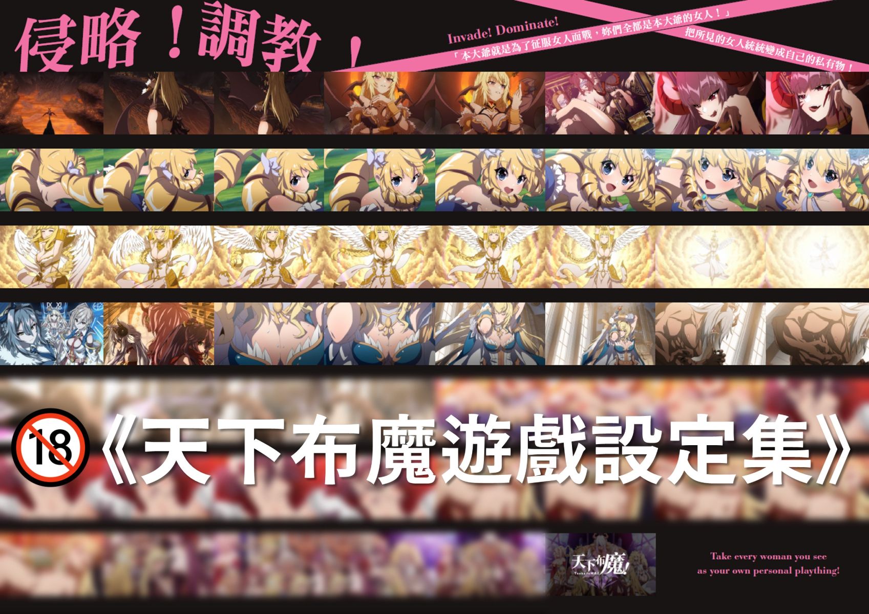 《天下布魔遊戲設定集》以精美全彩印刷收錄魔王、公主、魔導人偶、妖狐、魔法師、戰士、巫女、史萊姆娘、精靈、蛇女、貓妖、魅魔等55名魅力角色立繪與設定資料,以及35名人氣角色調教場景與滿滿福利畫面。首刷特典收錄珍貴虛寶「遊戲魂晶x20」及引爆話題的「清涼火辣雙面無柄扇」,扇面分別為苦悶又害羞的伊布利斯及露露美圖,一扇在手!體驗魔王「凱薩」征服的快感。