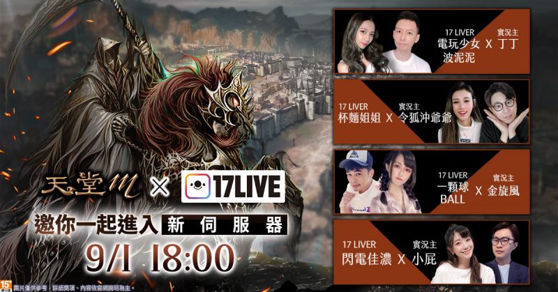 《天堂M》於9月1日同步與亞洲最大串流娛樂社群平台《17LIVE》合作,將由四名天堂M資深實況主:丁丁、小屁、令狐沖爺爺、金璇風,搭檔四名17 LIVER:電玩少女波泥泥、閃電佳濃、杯麵姐姐、一顆球ball,一起在新伺服器「鐮刀死神」體驗全新內容。