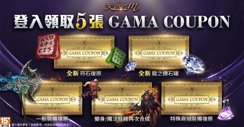 玩家最期待的GAMA COUPON即將開放!改版後可使用100金幣兌換5張GAMA COUPON,包含「一般裝備復原」、「特殊變身/魔法娃娃再次合成」、「特殊商城裝備復原」、全新效果「符石復原」、全新效果「龍之鑽石罐」。
