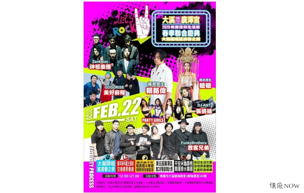 2020桃園信仰生活節相關資訊。(圖/大溪鳳山寺廣澤宮) 「搖滾宮主」賴銘偉受訪時表示,傳統上廣澤尊王有兩個大日子,分別在農曆二月與八月,再加上元宵節前各地有走春的習俗,廣澤尊王的信眾們在這些時間無法彼此交流,因而選擇妙應仙妃的聖誕日前後舉行這個大型活動,希望郭聖王的信徒間能彼此交流。這個時間點還有幾個意義,其一是大溪鳳山寺廣澤宮在過往都在這個時間舉辦頭家爐主的交接儀式,大家會一起喝春酒慶祝;其二是前幾年大溪鳳山寺廣澤宮曾遭遇祝融之災,2016年重建後入火安座的紀念日也在這前後,所以選擇這段時間舉辦「桃園信仰生活節」是有著多重意義的。