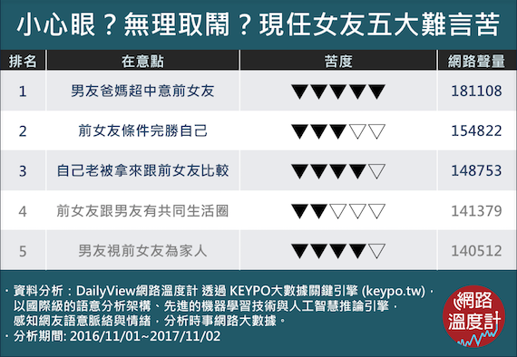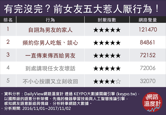 (圖三)有完沒完?前女友五大惹人厭行為KEYPO大數據關鍵引擎-調查時間2016/11/01~2017/11/02)
