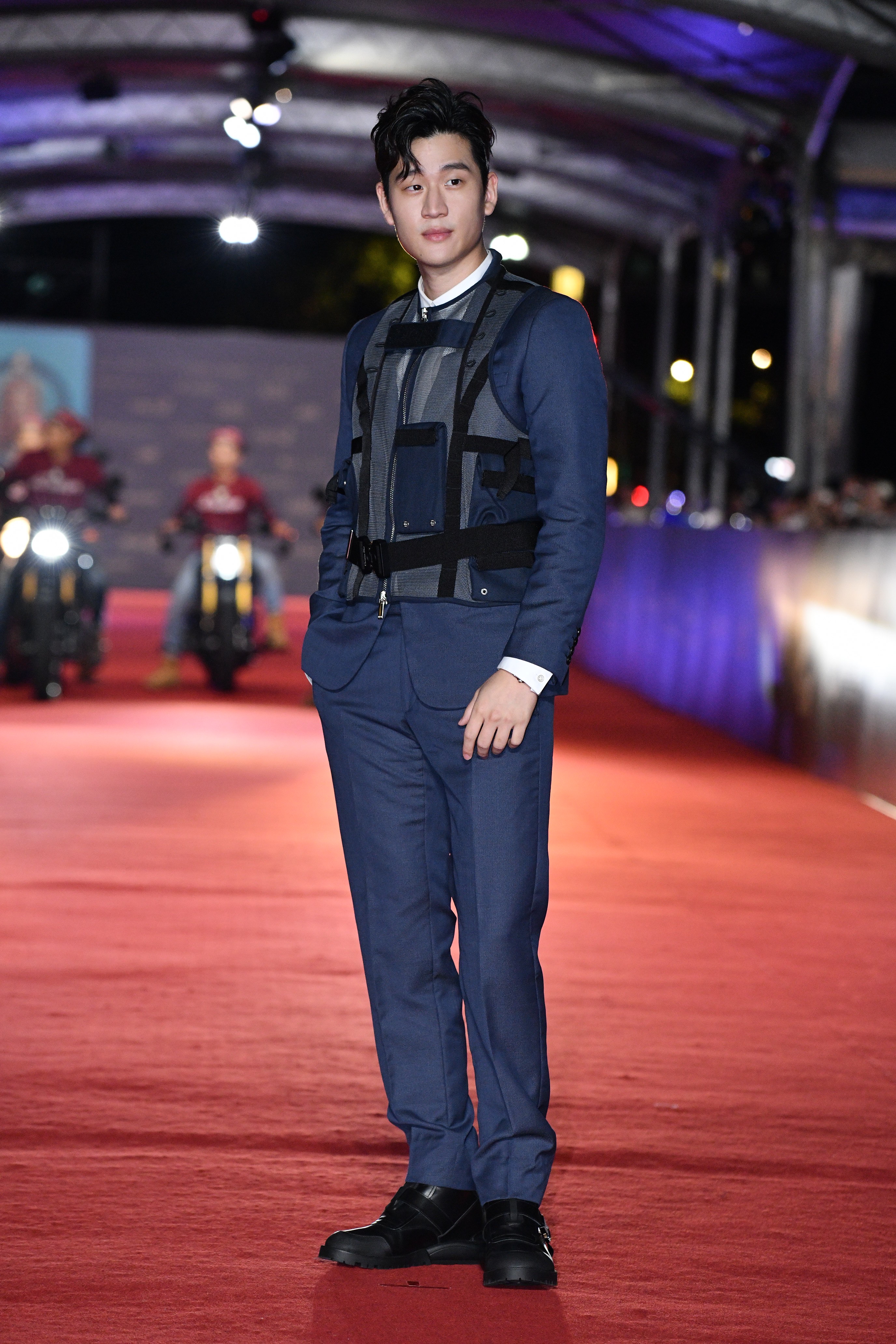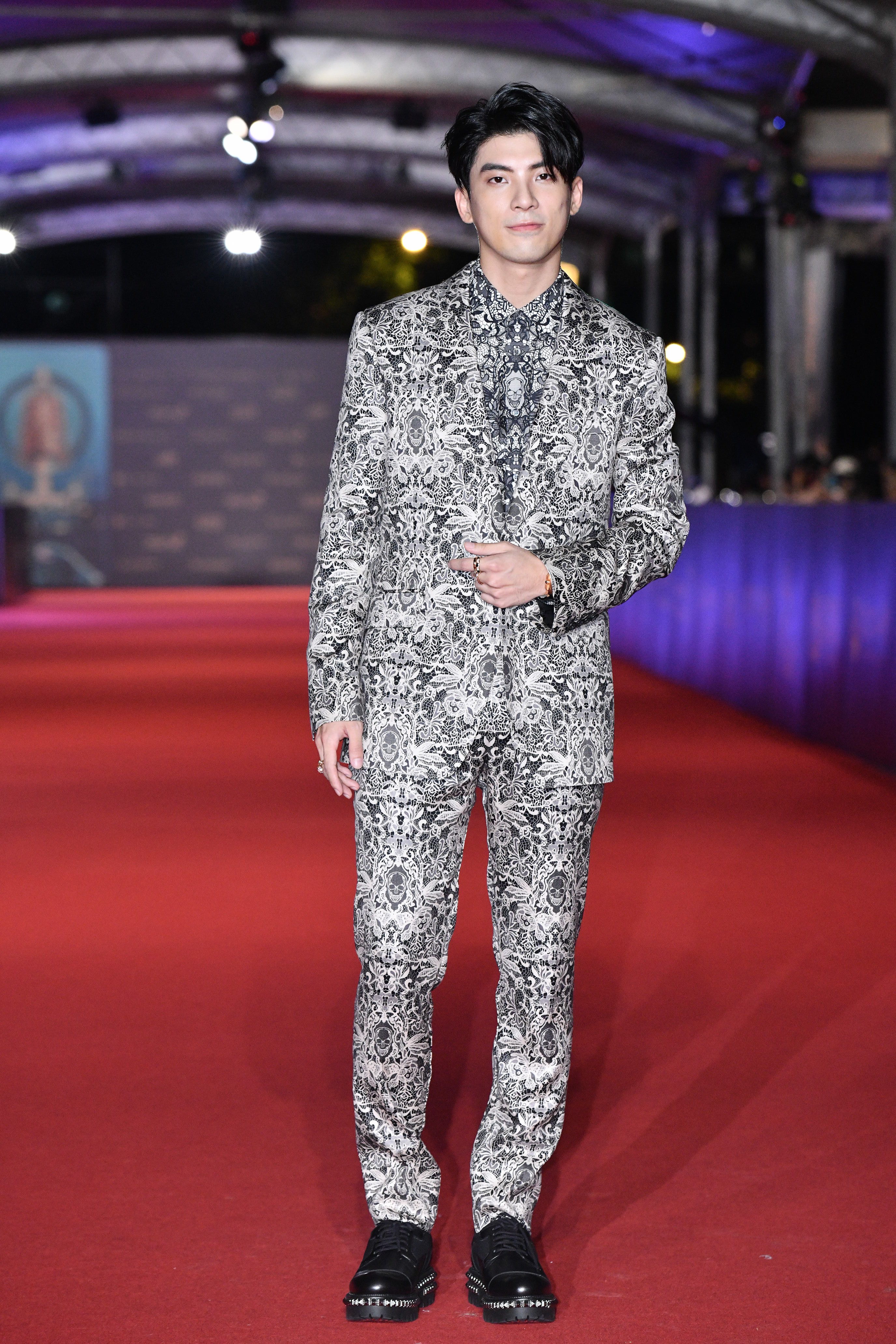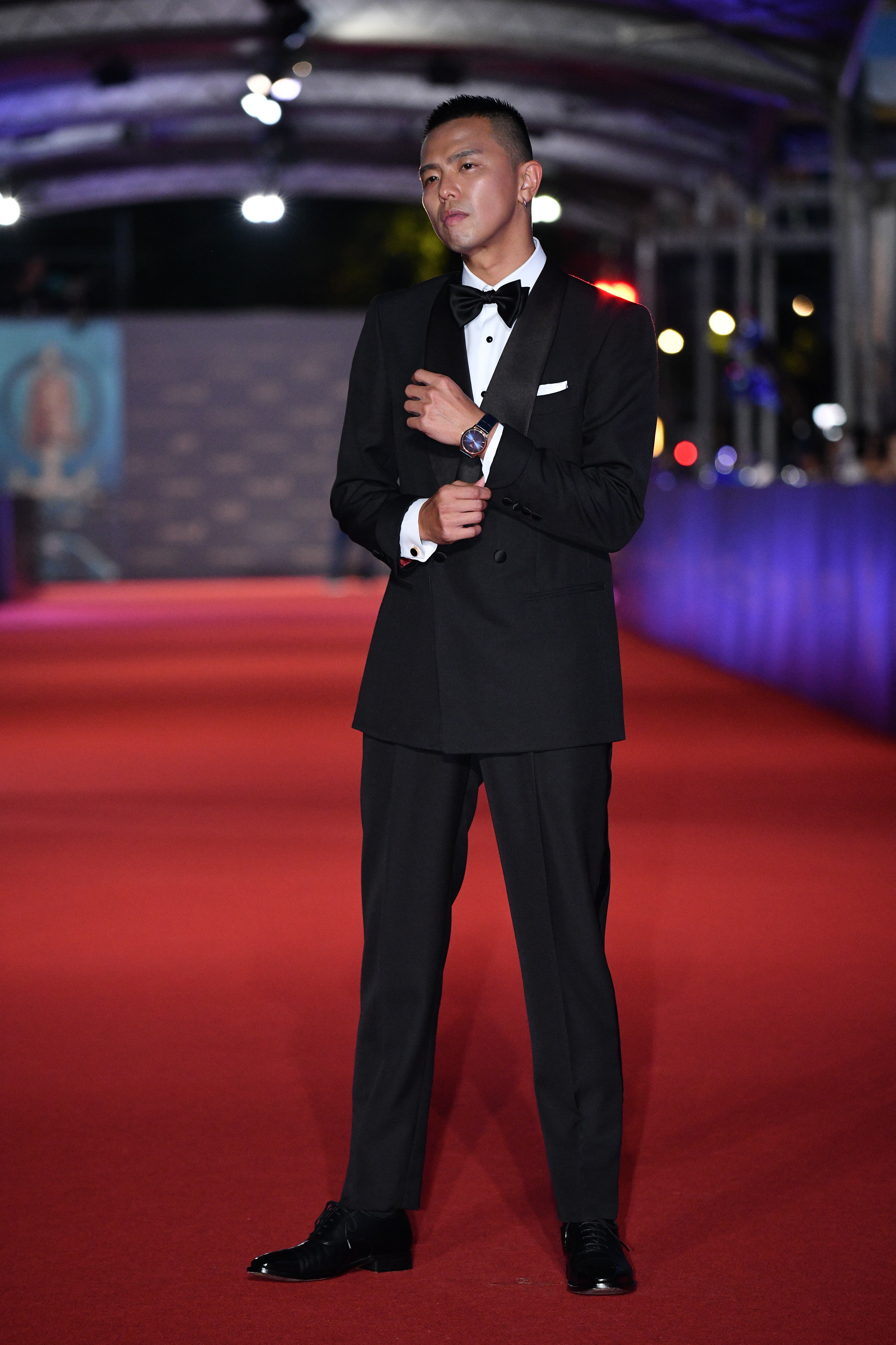 留著小平頭的小鬼黃鴻升,以難得正經的全套西裝步上紅毯,線條比例之精準,令他看起來胸膛寬闊、身型挺拔而修長,搭配雙層蝴蝶領結在帥氣中帶有俏皮玩心。