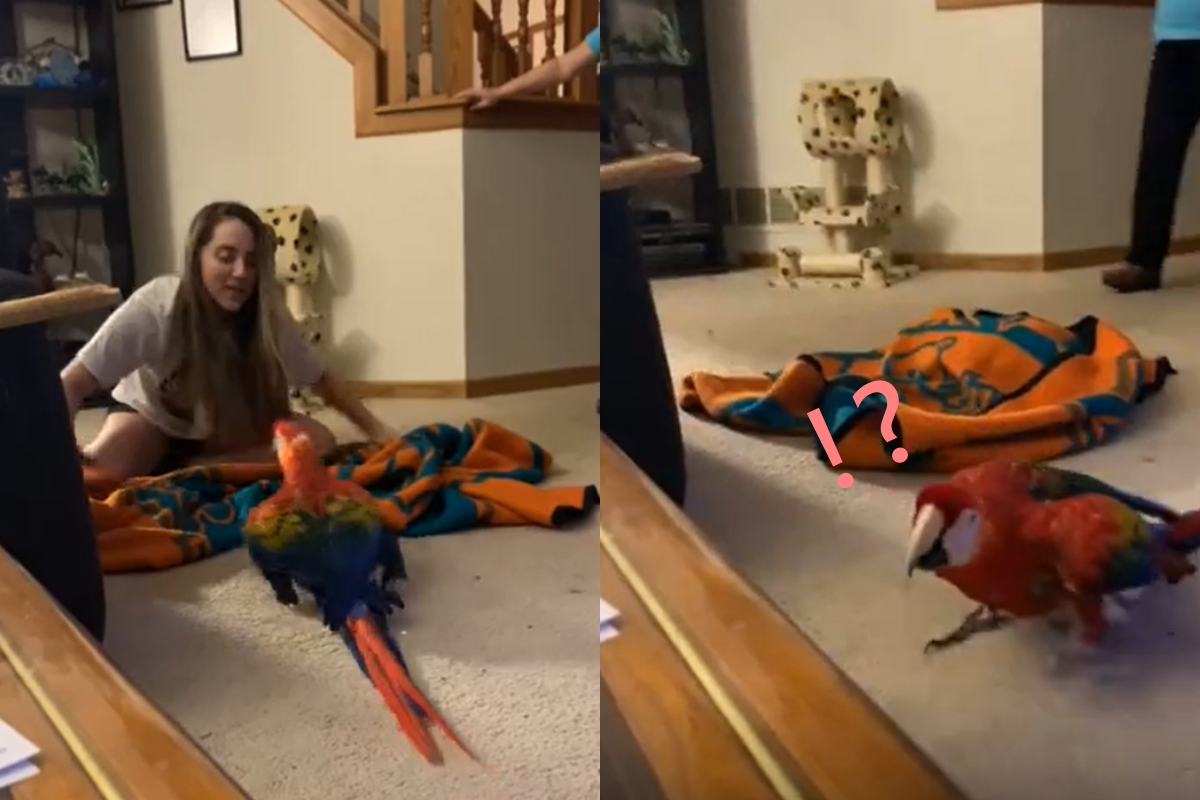 同樣的遊戲流程,但這次布往上丟後,主人一瞬間從旁邊跑走,當毯子落下,鸚鵡看到的是空蕩蕩的畫面,讓牠非常疑惑,緊張地拉開嗓子、發出少女般高亢的尖叫聲,向是在說:「啊啊啊啊啊啊!我的主人去哪裡啦?」。影片上傳網路後眾網友被這浮誇的叫聲給逗樂,大家紛紛回覆說:「鸚鵡:毯子你吃了我的人!!!(憤怒尖叫)」、「鸚鵡應該是因為主人的無聊生氣尖叫的吧!」、「聽到這叫聲還以為出大事!!」、「好像人的叫聲!」。