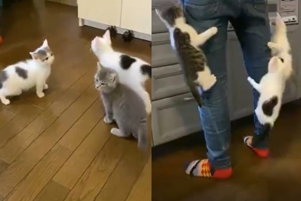 推主@uni_mugi_hachi本身飼養了4隻貓咪,由於家中的貓咪都不排斥小貓,加上牠們也會幫忙照顧小貓,因此推主有時會幫忙中途一些等待送養的貓咪。日前推主接回一窩小奶貓,常常在分享牠們與大貓們的互動。這天放飯時間到,推主還在廚房準備小貓們的餐食時,其中4隻已經等不及為在推主身邊,但眼見奴才動作太慢,其中三隻小貓竟然紛紛爬上推主的一雙大腿,等不及要趕快吃飯!