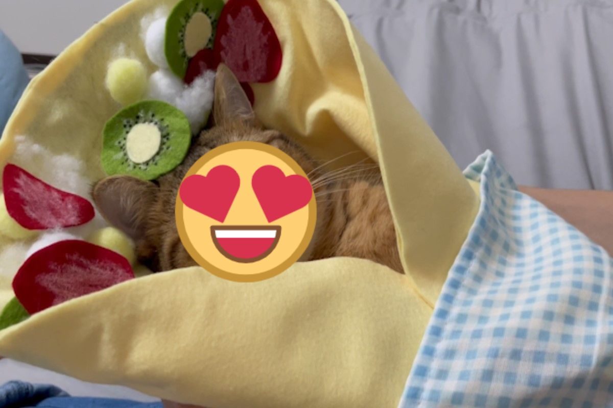 萌貓「喵喵可麗餅」還被加料網笑:看起來好欠吃! 米尼拉的奴才平時就很喜歡替牠cosplay,而牠也總是乖乖地配合,這天奴才原本在替米尼拉做小床,突然發現布料的顏色很像可麗餅的餅皮,於是奴才靈機一動發揮巧手,將一些不同顏色的不織布做成草莓以及奇異果切片,並利用棉花與棉球裝飾成奶油,將米尼拉包起來後再套入藍白格子的布套當作紙盒,看起來就像是一份既可口又美味的「水果可麗餅」!