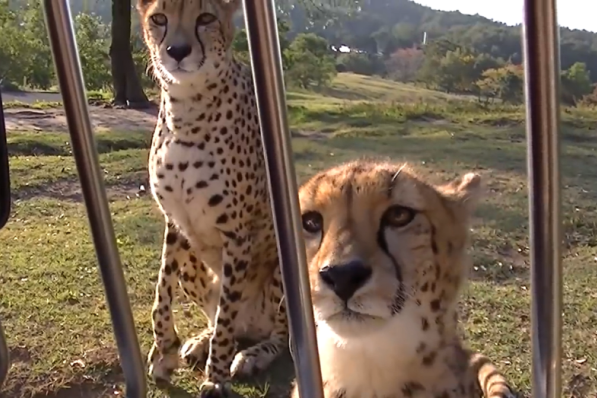 一台裝有護欄的車子開到綠地中間,兩隻好奇的獵豹立刻被吸引上前,可能車中的人是牠們的餵食者,獵豹乖巧地坐在車子外等候,眼神專注地盯著鏡頭後的人類,時不時便叫幾聲,雖然露出的粗大牙齒極為駭人,可從這兇猛嘴裡的聲音卻異常奶萌,似是貓的「喵喵聲」,一聲即停的頻率又像狗,實在太可愛啦!