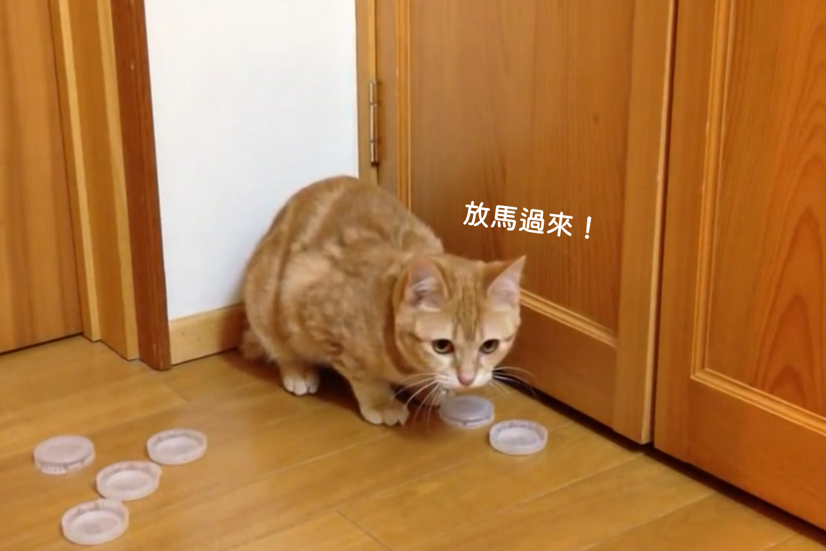 2013年時,這隻橘貓對瓶蓋非常著迷,奴才便準備了許多道具,打算與牠來一場大戰!影片中能見到橘貓眼神專注、認真,眼睛緊緊盯著奴才的手勢,小腦袋中正分析著對手會從什麼角度攻來,身體也隨之擺到正確位置,影片中的第一「球」,奴才不小心投出超界「壞球」,貓咪卻沒興奮地跑出位置叼回,而是立刻站回準備位置,看起來相當專業!