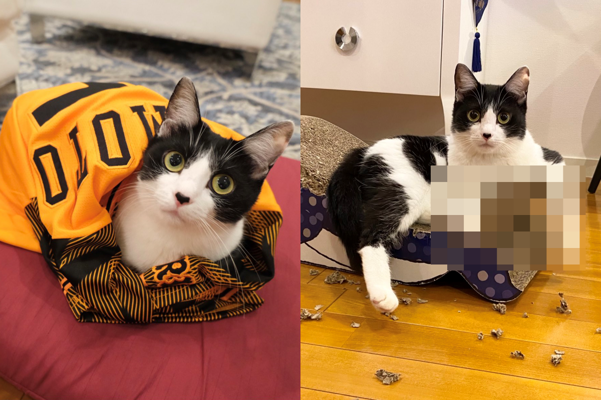 本小姐沒在怕的啦!日本知名演歌歌手藤彩子,常常在Twitter上分享自家兩隻貓咪的日常,這天發現貓姐姐狠狠蹂躪了鯨魚造型貓抓板,地上遍布殘骸,但兇手本貓卻氣定神閒地躺在上頭,「饋著手」看奴才,彷彿在問:「我弄成這樣,怎麼了嗎?」。