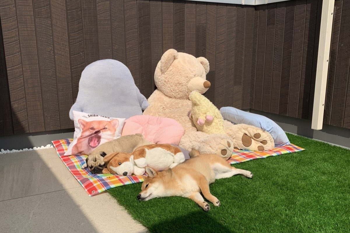 推主將家裡的熊熊抱枕、狗狗抱枕一個一個般去庭院,想趁著大太陽時好好曝曬一下,放好便離開,但再次回來時發現裡頭有兩個毛茸茸的狗娃娃,看起來非常真實,你們有看到哪裡不對勁嗎?
