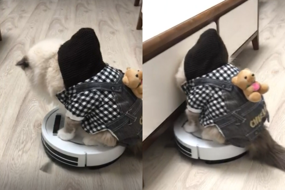 這是在2017年中國昆明市拍攝得貓咪,那天牠坐在掃地機器人上環遊家中,機器嬌小的身形在各種縫隙中無往不利,毫不猶豫地往電視櫃衝過去,於是貓咪瞬間撞上櫃子原地倒下,可躺在地上的牠竟毫無動作,就只是靜靜地跌倒、靜靜地躺在那接受自己的失敗。