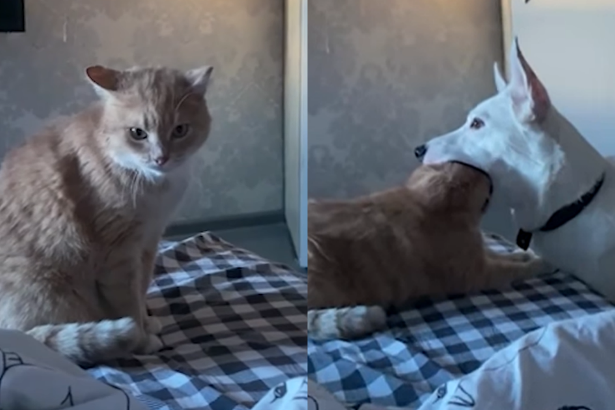 狗狗這不能吃啦!狗是一種好奇心很強的動物,什麼東西都想放到嘴巴裡咬咬看,今天就分享一則狗狗把貓頭含到嘴巴裡試試看的影片,被吐出的貓咪傻眼冷在原地,彷彿正憤恨的罵著:「你這小笨狗!」。