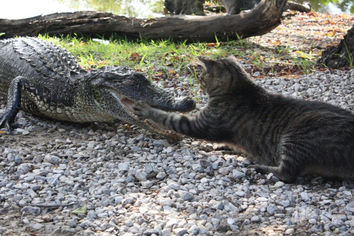 千萬不要惹到喵星人!一群遊客到美國路易斯安那州南部沼澤區渡假,進行餵鱷魚體驗時突然闖入一隻虎斑貓,牠不僅一點都不怕,甚至還對一隻鱷魚「怒賞巴掌」,嚇得鱷魚驚訝地張大嘴秒飛奔回水裡!