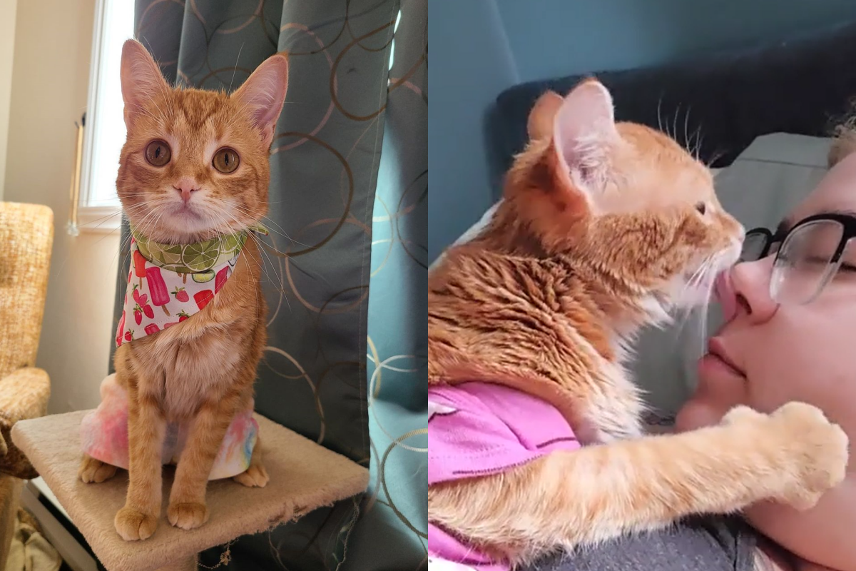 這隻可愛的貓咪叫做「梅茲(Maze)」,是隻沒有尾巴的堅強母貓,因為有大小便失禁的問題所以常年穿著紙尿布,但這並不影響牠活潑好動的性格,仍是勇敢地一步一步在家中跑跳。飼主對梅茲非常寵愛,常常把牠抱在懷中親吻,這天她正快樂地吻著貓咪的小肉球,沒想到梅茲竟反撩一把,對著飼主的鼻子一陣狂親!