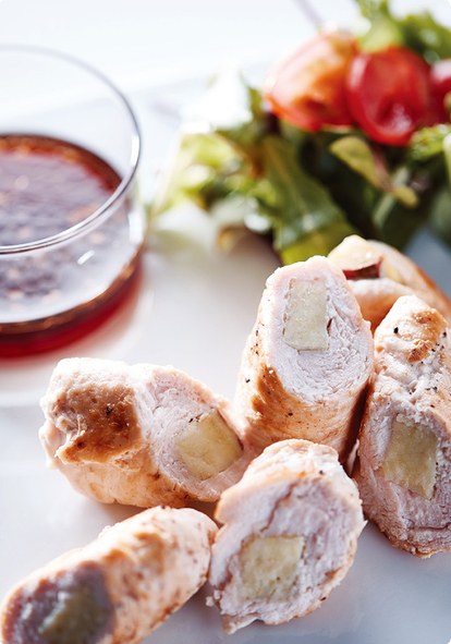將100g雞胸肉蓋上保鮮膜或塑膠袋之後,用擀麵棍或玻璃瓶把雞胸肉壓成薄片狀,然後用雞胸肉片包住瓜條,約3-4條,接著煎到裡面完全熟透就完成了。再配上生菜沙拉和小番茄一起吃,就更豐盛,又有飽足感。這是一道高蛋白料理,當作給孩子們配飯的菜餚也相當不錯喔!