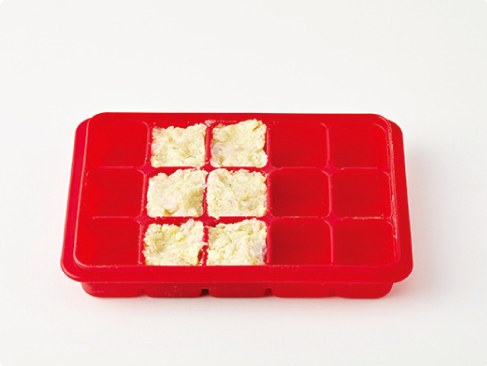 NEMO極力推薦的萬能料理工具之一,就是矽膠製冰盒。以矽膠製成的料理工具既耐熱又不會吸收微波,可以安心使用。將100g雞胸肉切碎。接著將地瓜切成大塊後,裝進微波專用容器中,加入2大匙的水,微波加熱大約2~3分鐘。從微波爐取出後,將地瓜的外皮剝掉並靜置一會兒,等到冷卻後,再裝在碗裡用叉子壓成泥狀。