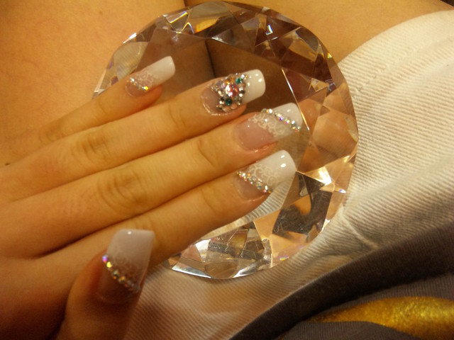 樣式是夾心水晶,底部用簡單的白色,在水晶和水晶層的中間剪一小段蕾絲夾在中間做裝飾,表面用小鑽做裝飾。 無名指上面的裝飾是用不同顏色的鑽貼成愛心形狀噢,長度約兩格半。