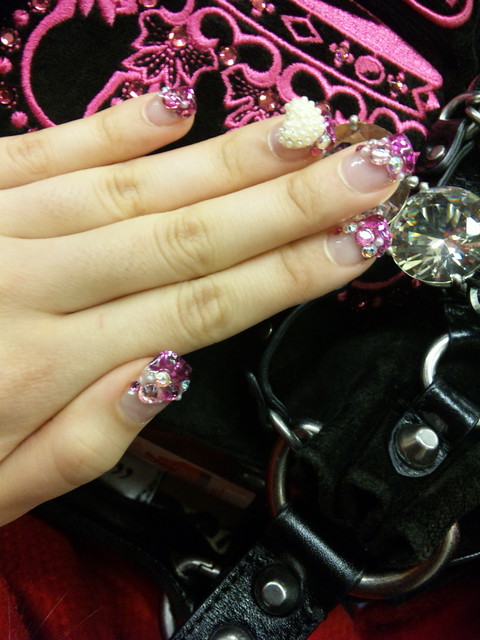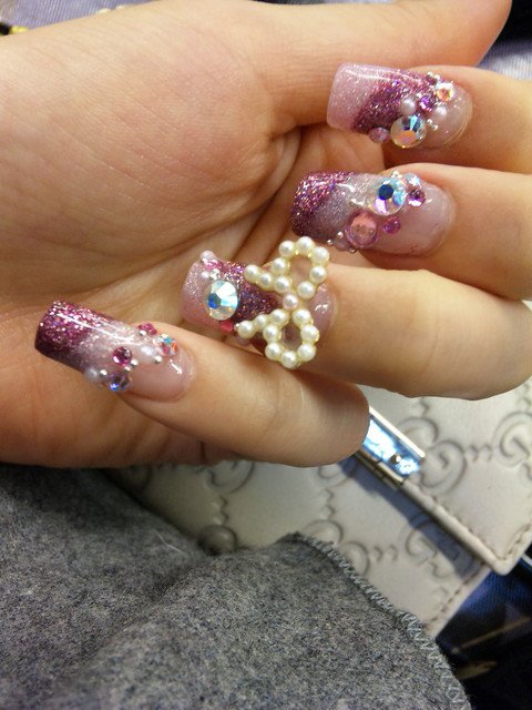 樣式是璀璨水晶,桃紅色璀璨粉裡面有許多亮片,長度不到一格,磨成圓方形,用小鑽和珍珠愛心裝飾品裝飾。