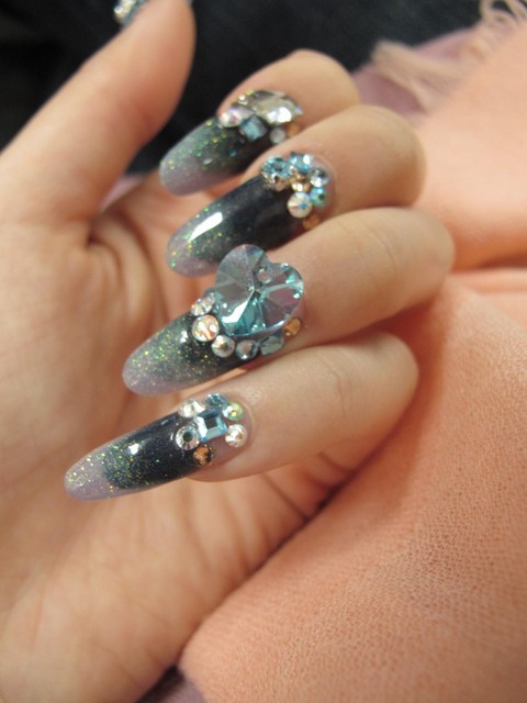 樣式是漸層水晶,利用不同的藍色水晶粉重疊做出漸層,磨成尖形,長度有四格,用大愛新水鑽和小鑽做裝飾。