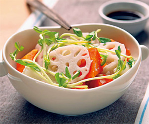 【準備材料】 紅蘿蔔1條、蓮藕1/2條、馬鈴薯1個、豌豆苗1小把