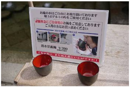 或是可以利用現場提供的長柄杯來喝… 這裡對杯子的清潔設有紫外線滅菌裝置,不過大家還是都會倒在手上喝,感覺比較衛生…