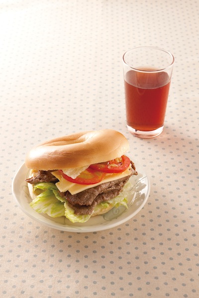 材料:洋蔥5g,美生菜1片,牛肉片20g,貝果麵包1個,起司片20g,番茄片10g